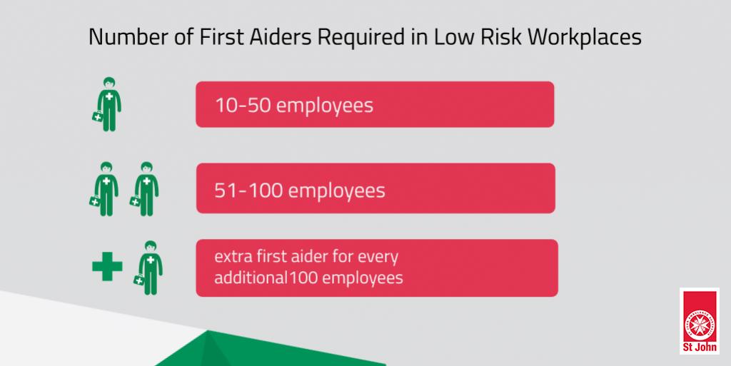 If in doubt, it is always better to have more first aiders than less. For example, if your workplace is a low risk office with 49 employees you are only ‘required’ to have one first Aider according to the code. However, you may want to consider the situation from a risk management perspective and consider the possibility of what could happen if that First Aider is off-site for a meeting or lunch, or even if that person requires First Aid treatment themselves. Common sense would reason that this is quite likely, in which case an extra First Aider would be a good business decision to minimise risk.